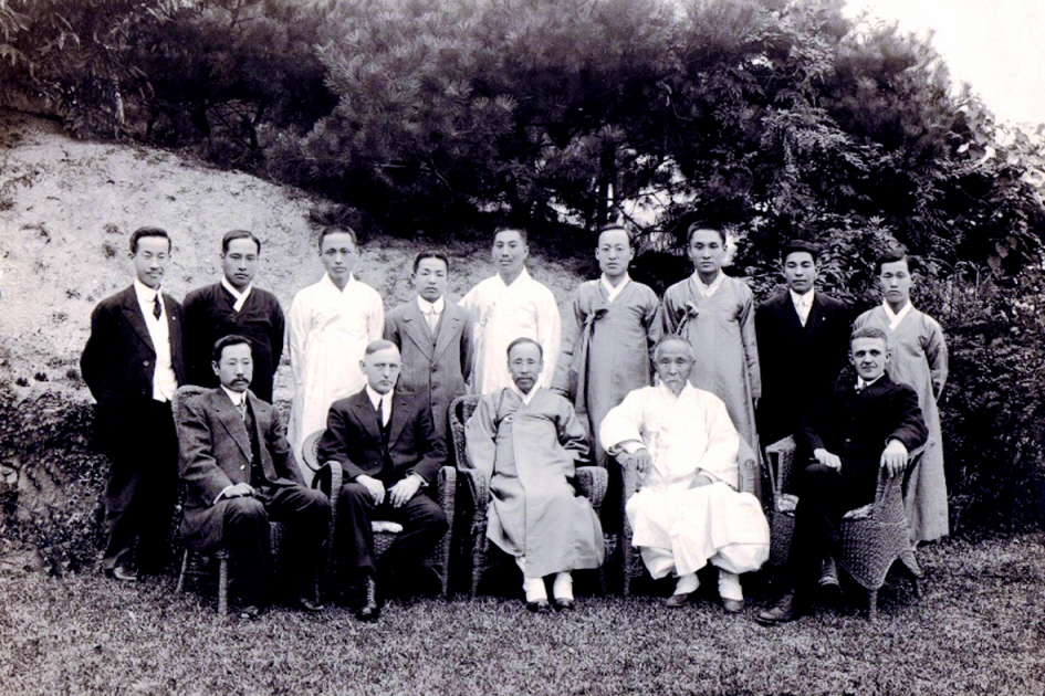 [영구뒤 왼쪽부터 이인영, 구자옥, 신흥우, Brockman, 상주들, YMCA관계자들]