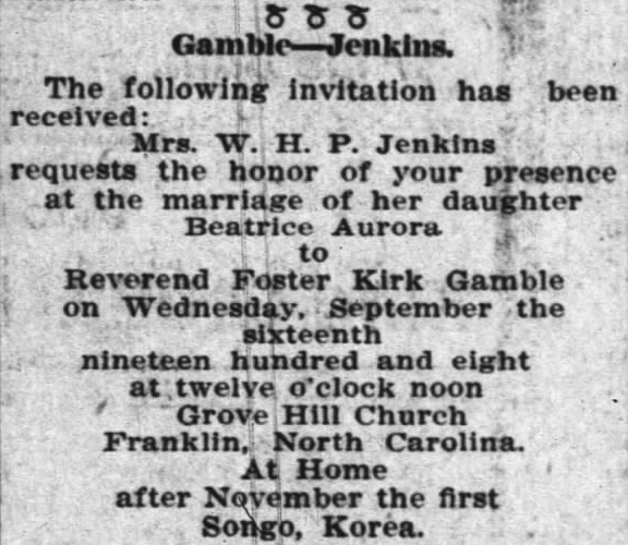 갬블 선교사 부부의 결혼 소식을 알리는 신문기사