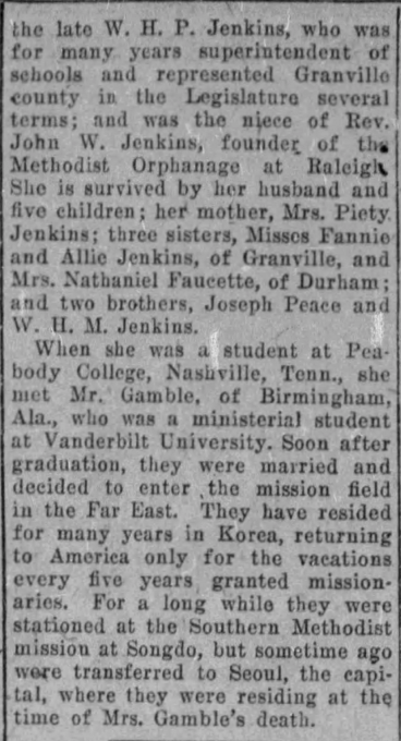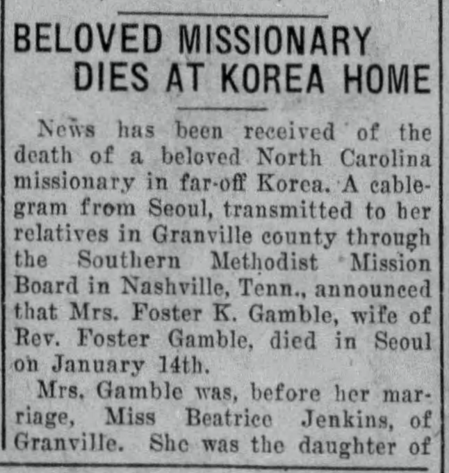 “Beloved Missionary dies at Korea Home” <The News and Observer> (Raleigh, North Carolina, 21 Jan 1927, Fri): 6.