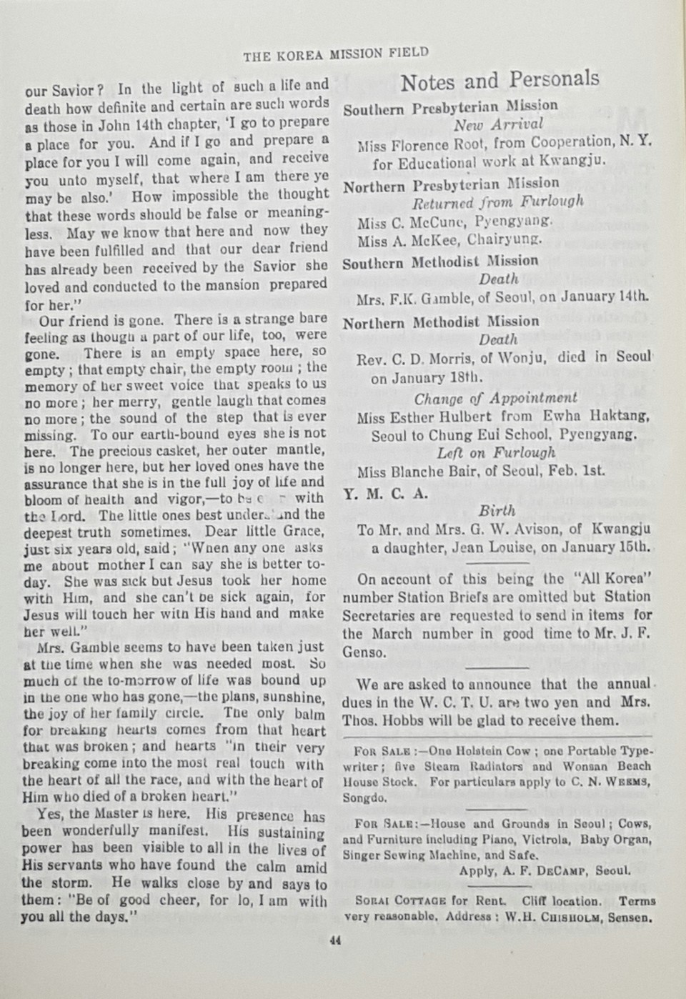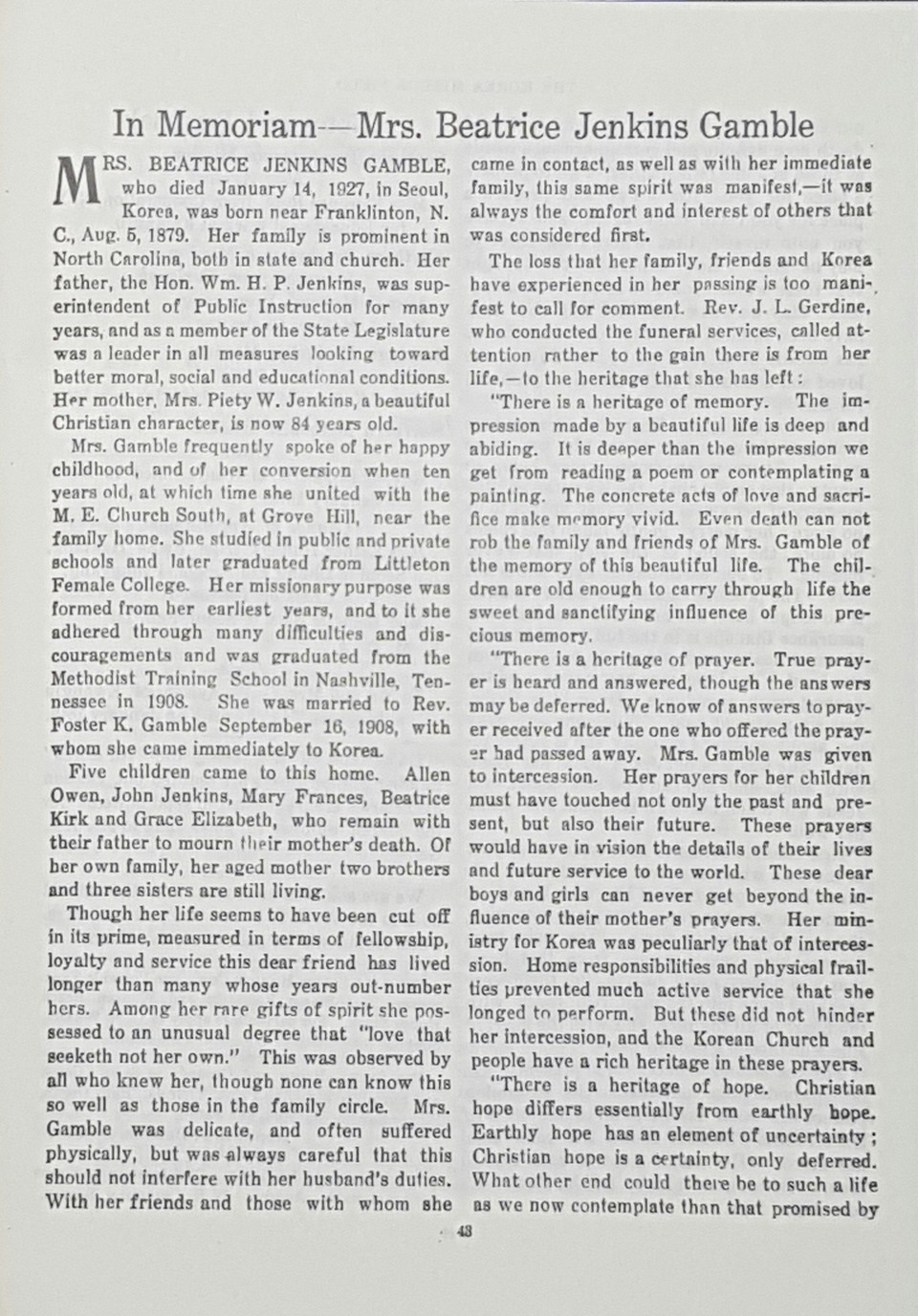 <Korea Mission Field> 1927년 2월호에 실린 베아트리체 A. 젠킨스 갬블 선교사에 대한 추모의 글