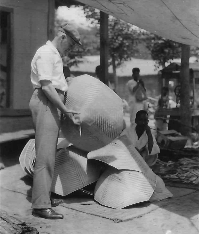 한국인 농부들이 쓰는 햇빛 가리개 모자를 살펴보는 헨리 D. 아펜젤러 선교사