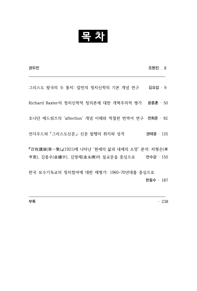 이번 호에도 값지고 귀한 연구들이 실렸습니다. 특별히 46차 정기학술대회 주제였던 “교회사 속에서 교회와 정치”를 다루는