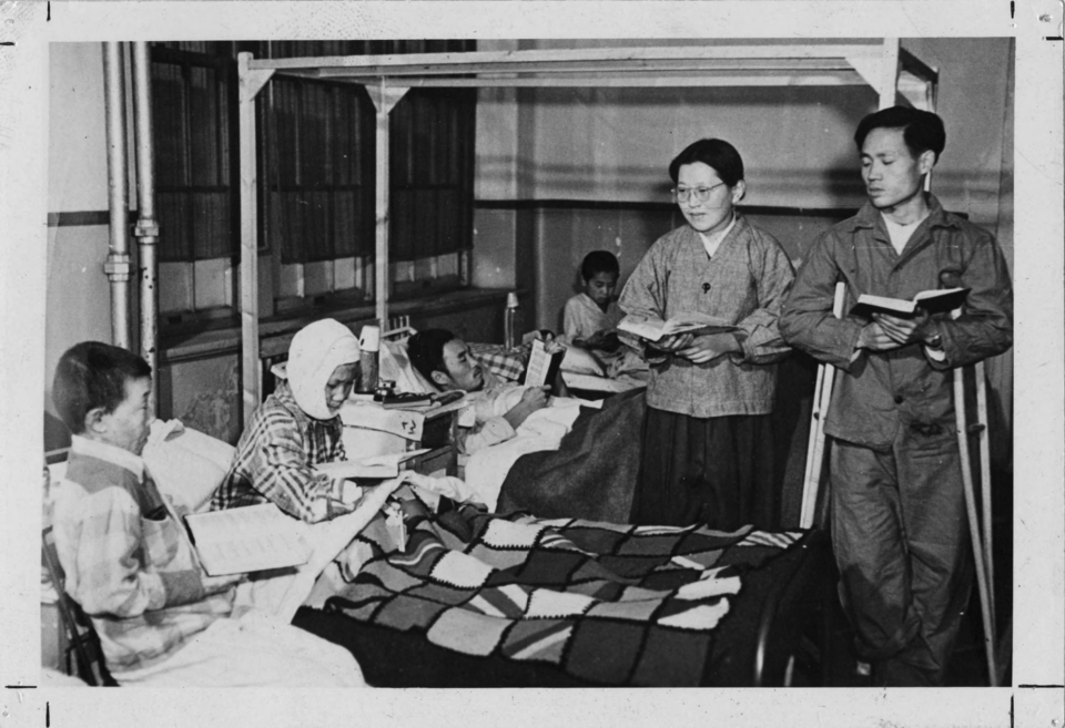 1953년경 한국전쟁으로 지체장애를 입고 서울 세브란스병원에 입원 중인 환우들이