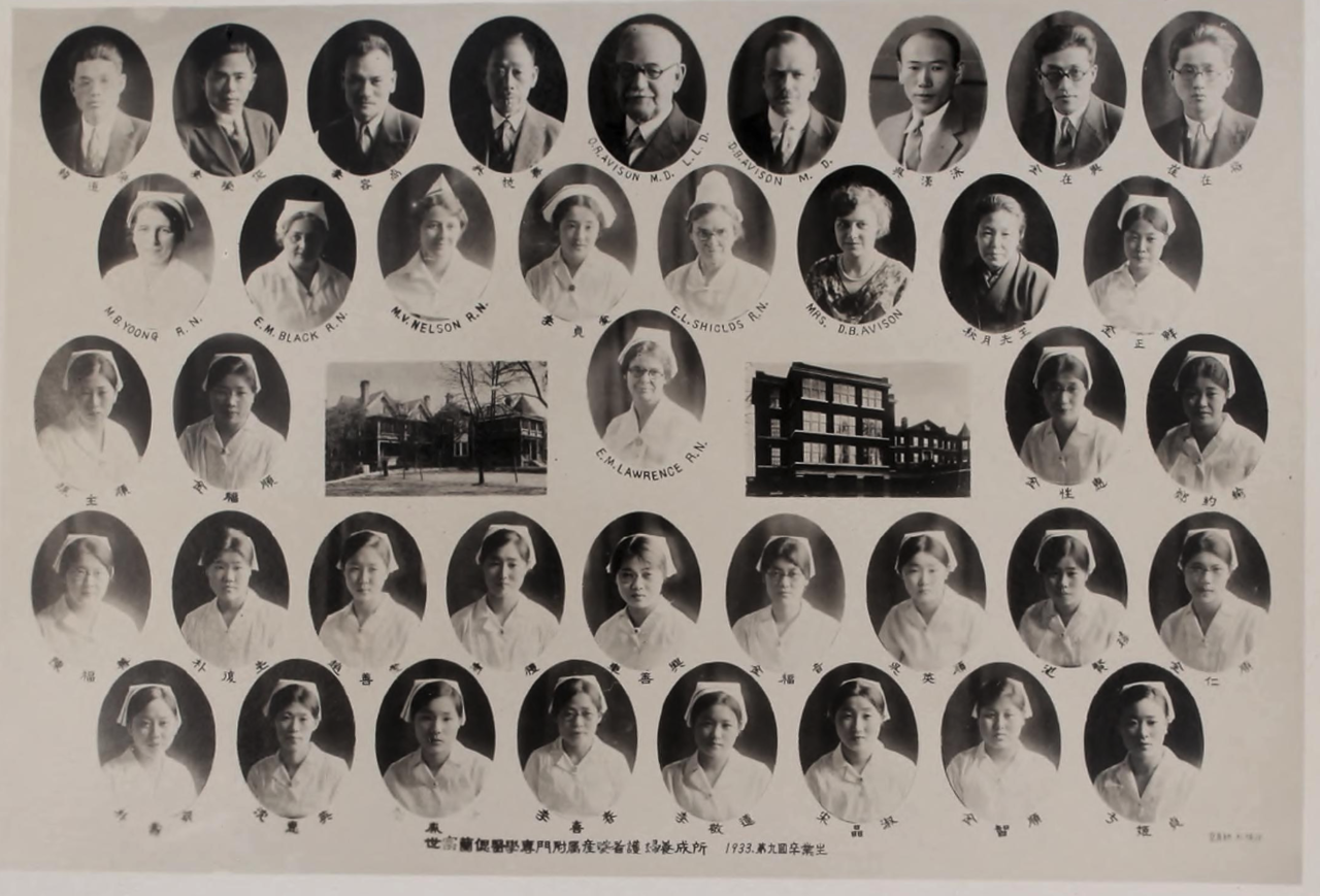 1933년 세브란스의학전문학교 부속산파간호부양성소 제9회 졸업생들과 교수진들의 사진이다.